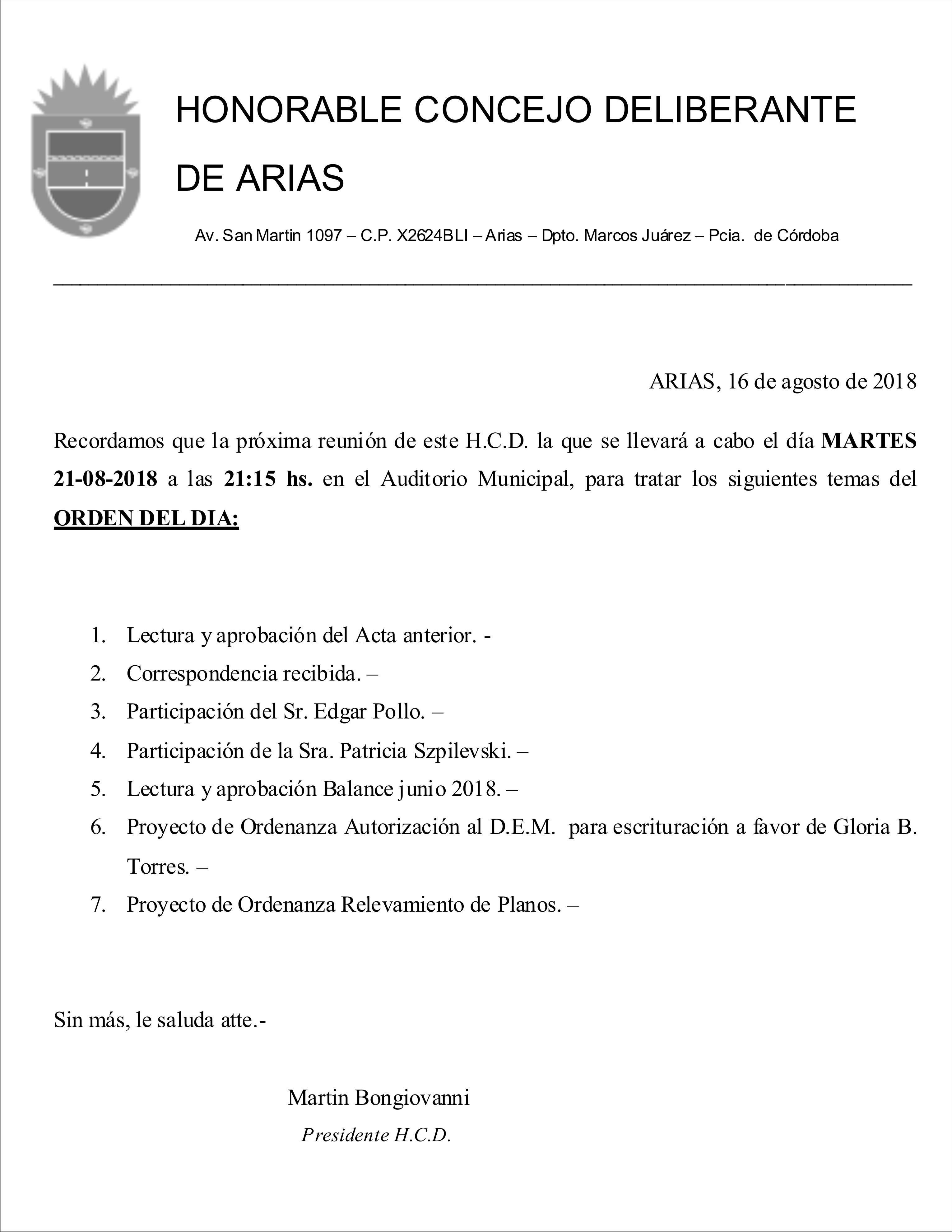 ARIAS, 16 de agosto de 2018Recordamos que la próxima reunión de este H.C.D. la que se llevará a cabo el día MARTES 21-08-2018 a las 21:15 hs. en el Auditorio Municipal, para tratar los siguientes temas del ORDEN DEL DIA: