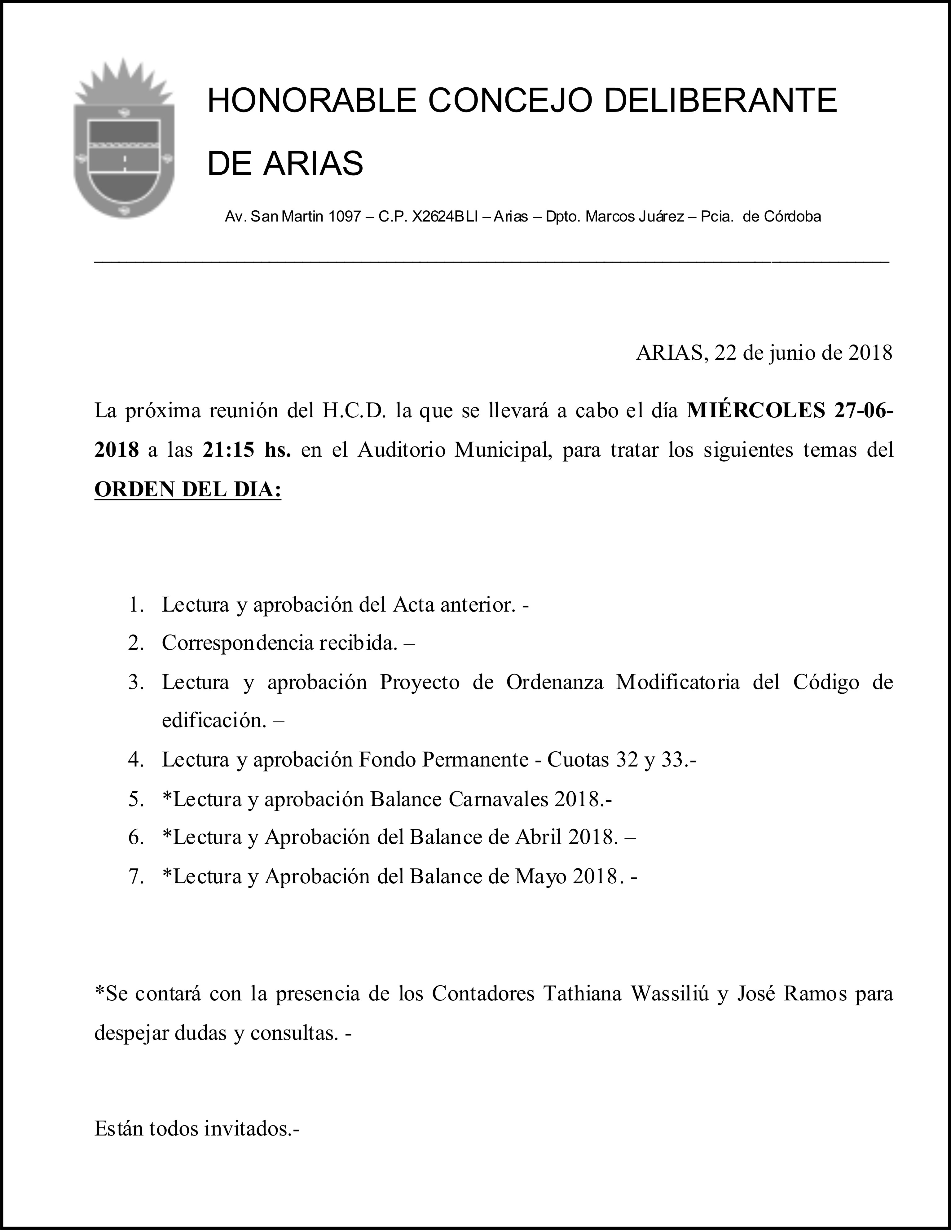 Se notifica que la próxima sesión ordinaria, se llevará a cabo el día MIÉRCOLES 27 DE JUNIO DE 2018 A LAS 21:15HS EN EL AUDITORIO MUNICIPAL. –