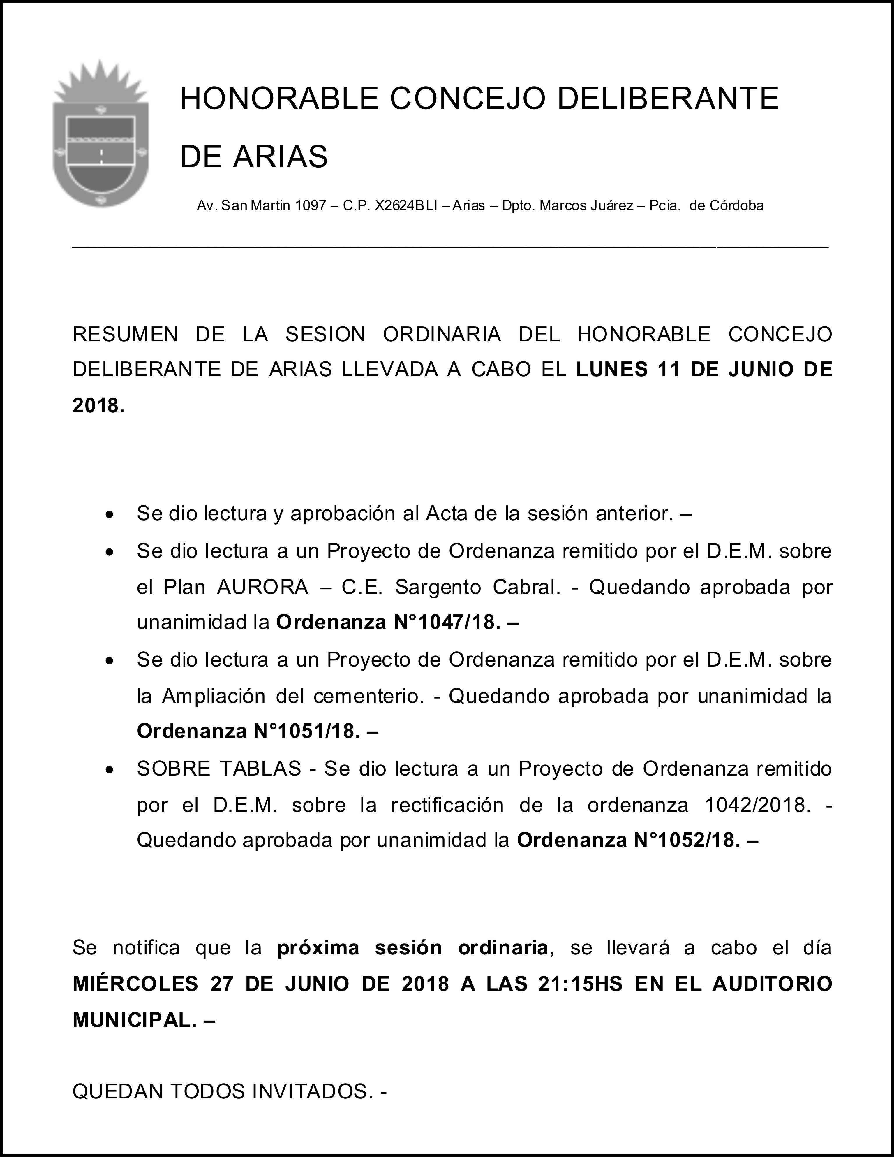 RESUMEN DE LA SESION ORDINARIA DEL HONORABLE CONCEJO DELIBERANTE DE ARIAS LLEVADA A CABO EL LUNES 11 DE JUNIO DE 2018.