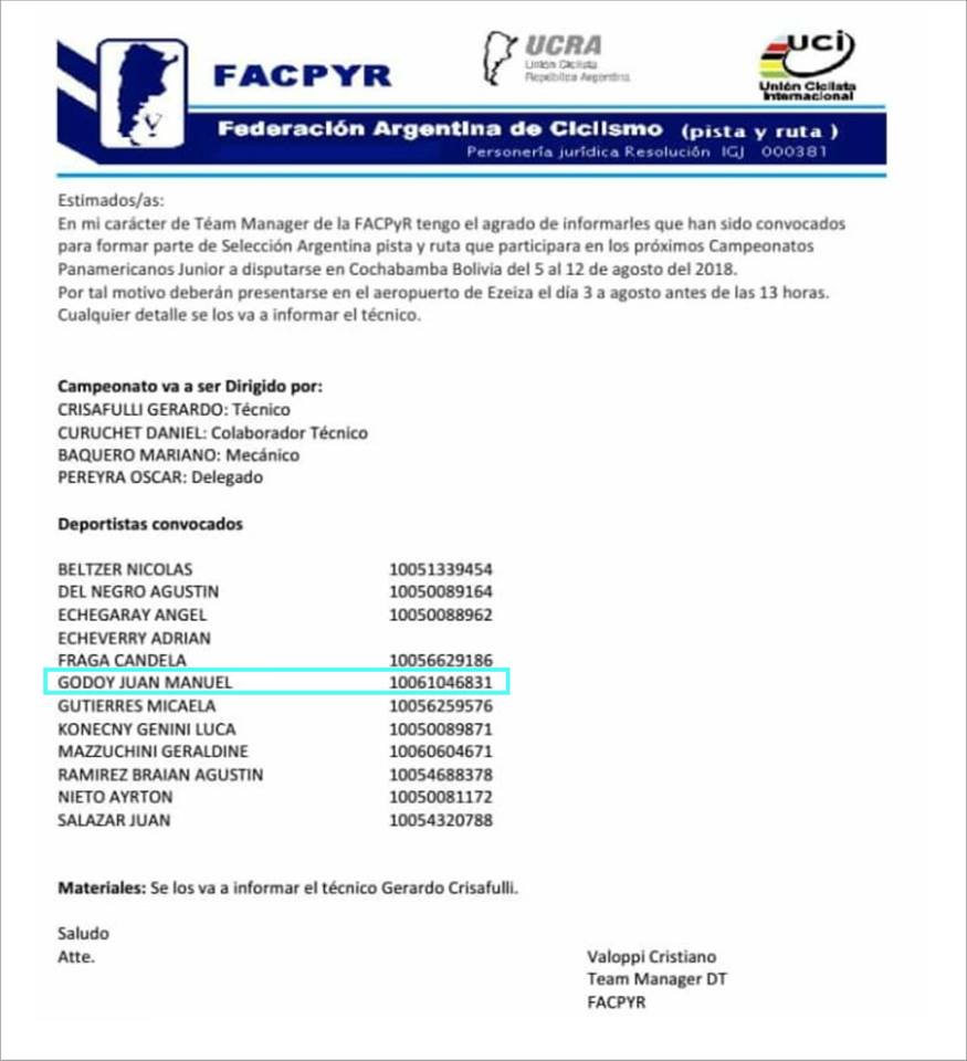 Felicitaciones Juan Manuel Godoy, de nuestra Escuela Municipal de Ciclismo, convocado a integrar la selección Argentina, Pista – Ruta, para participar en los Panamericanos de Bolivia.