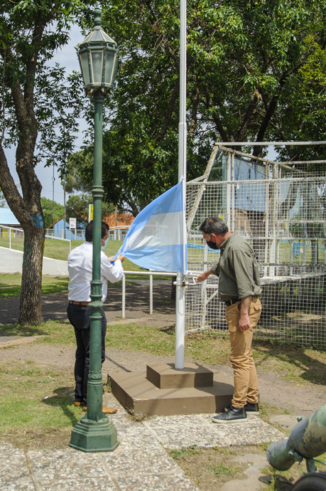 Realizaron el izamiento en el monumento “Héroes de mi Pueblo”, el Presidente del H.C.D., Dr. Martín Bongiovanni junto al secretario de gobierno Sr. Javier Defagot.
