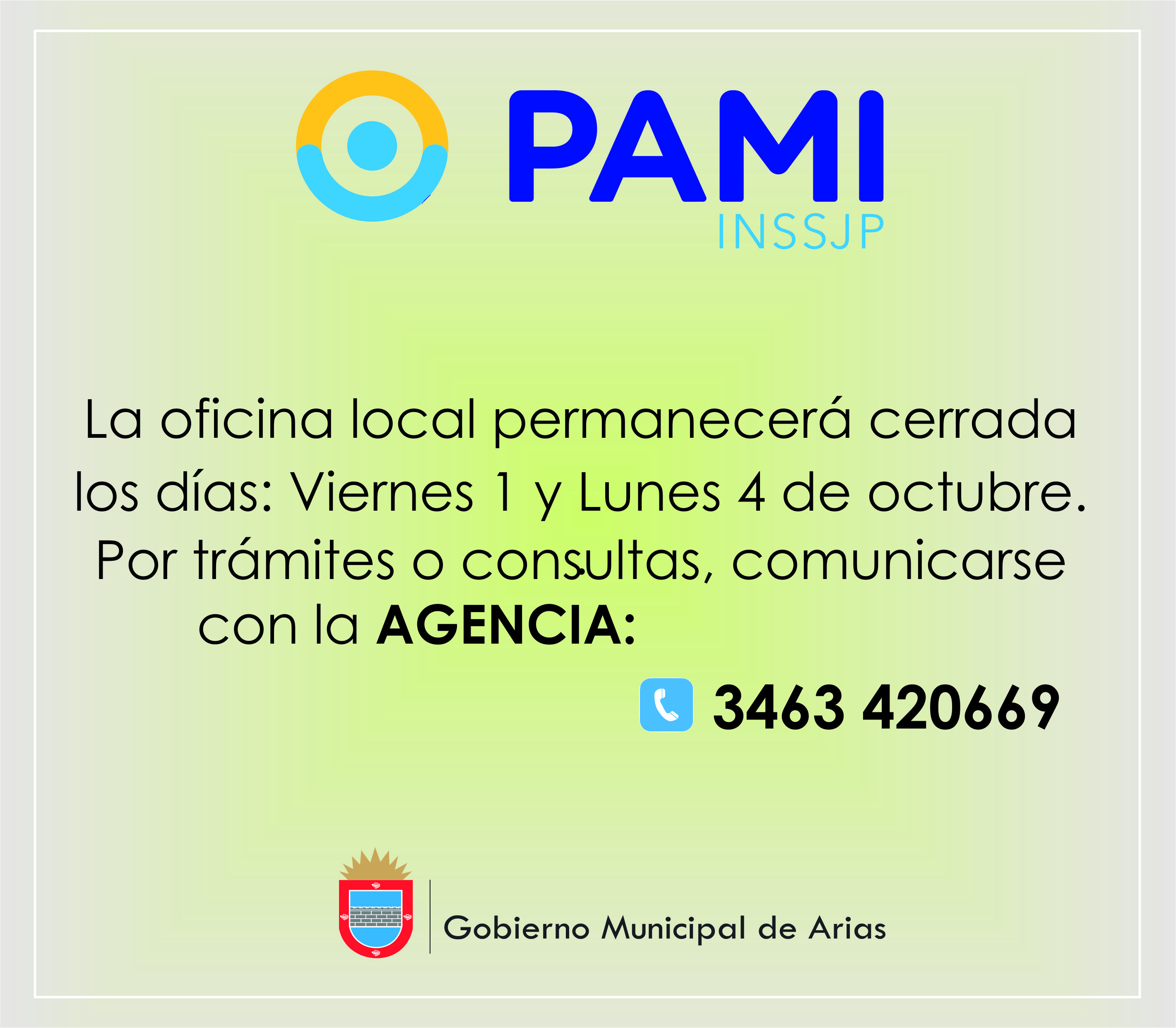 Como lo dice el comunicado, la Oficina de PAMI local, permacerá cerrada el viernes primero y el lunes cuatro de octubre, retornando la atención el día martes 5 de octubre de manera habitual.