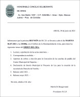 Informamos que la próxima REUNIÓN del H.C.D. se llevará a cabo el día MARTES 06-07-2021 a las 20:00hs. en el Edificio de la Municipalidad de Arias, para tratar los siguientes temas del ORDEN DEL DIA: